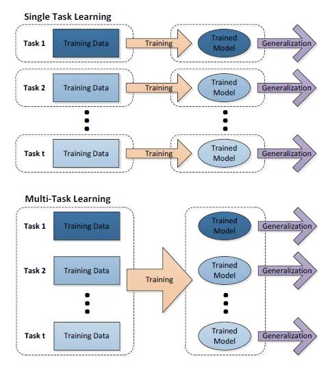下图展示的是单任务学习和多任务学习的流程图,可以对比一下区别。