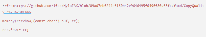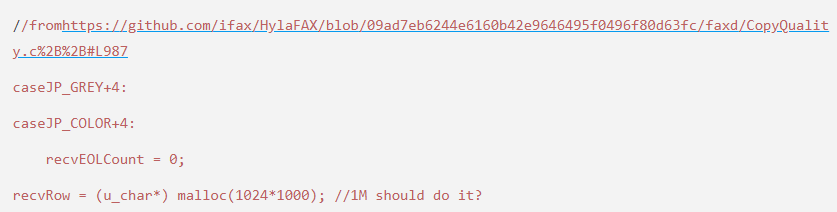 在我们的研究过程中,我们发现HylaFAX和HylaFAX+的功能非常丰富,而且完全可以实现传真机通信的全部要求。除此之外,它们的源代码也非常好读,不过在读源代码的过程中,我们发现代码中负责进行ECM页面传输的部分存在安全问题。请大家看下面的代码: