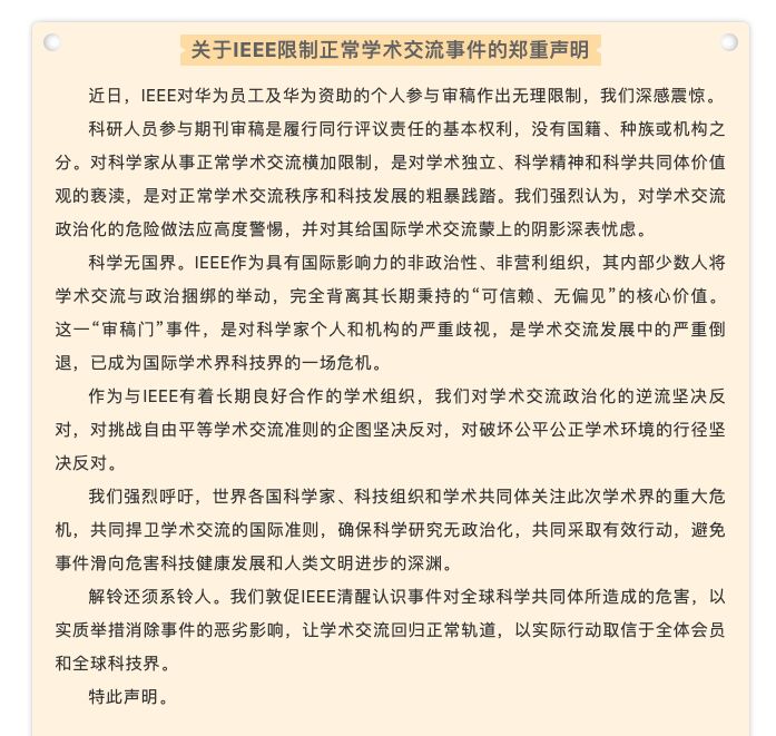 6 月 2 日,中国电子学会、中国通信学会等在内的中国十大学会发表联合声明,表示:IEEE 作为具有国际影响力的非政治性、非营利组织,其内部少数人将学术交流与政治捆绑的举动,完全背离其长期秉持的 “可信赖、无偏见” 的核心价值。这一 “审稿门” 事件,是对科学家个人和机构的严重歧视,是学术交流发展中的严重倒退,已成为国际学术界科技界的一场危机。