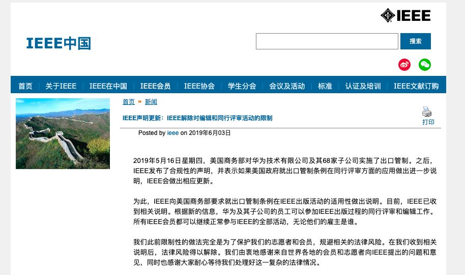6 月 2 日,IEEE 官方发表声明表示:经美国商务部就出口管制条例在 IEEE 出版活动中的适用性做出的说明,华为及其子公司的员工可以参加 IEEE 出版过程的同行评审和编辑工作。所有 IEEE 会员都可以继续正常参与 IEEE 的全部活动,无论他们的雇主是谁。