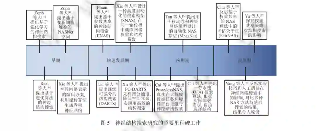 手工设计神经网络受多种因素影响, 例如不同层间的连接方式、卷积类型与大小、网络深度等. 这不仅需要 网络设计专家具有丰富的机器学习知识, 还严重依赖专家在实践过程中总结的经验规律. 因此, 自 2015 年开始, 神 经结构搜索得到广泛关注. 到目前为止, 神经结构搜索能够自动化地设计出性能优越的神经网络结构, 在图像识别 等任务上取得显著效果. 这种成功是值得纪念的, 而且回顾 NAS 的整个发展阶段对于今后的发展有着重要意义. 图 5 是神经网络搜索研究的重要里程碑工作, 我们将从 4 个阶段分别介绍 NAS 算法的发展, 着重介绍每一阶段内 具有代表性的成果. 这里我们需要说明的是, 考虑到现有 NAS 方法中存在的诸多问题, 且近两年不断有工作在反 思神经结构搜索, 我们希望第 4 阶段中的反思能够促使 NAS 技术在未来的发展中实现更大的突破.