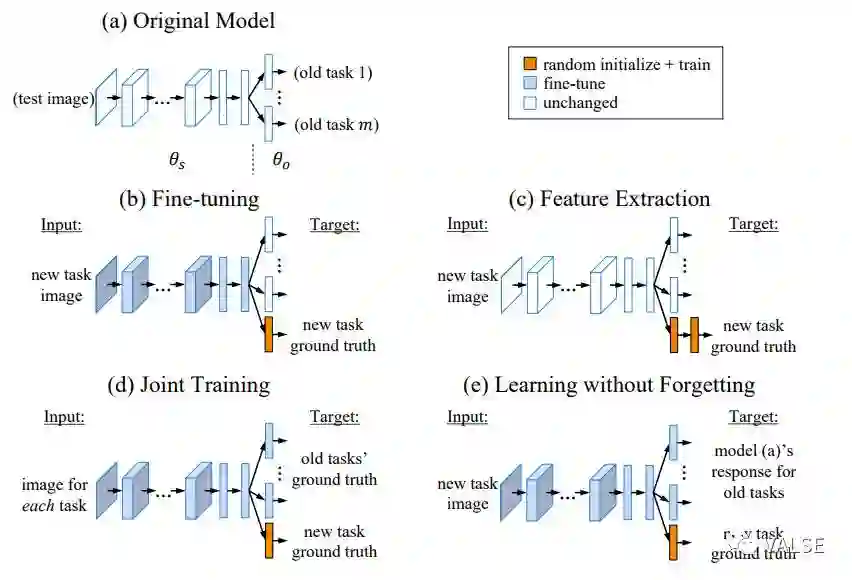 在这之后一个比较重要的工作来自于”Learning without Forgetting” (LwF) [3],这篇文章仍然从最简单的分类任务入手,巧妙运用了Knowledge Distill技术来缓解这样的问题。具体地,[3]使用旧模型作为teacher model,对于新任务中的每一个样本。和传统的Finetune比起来,LwF使用了teacher model输出的soften softmax对新任务中的样本进行约束。这里即使新任务与旧任务的类别定义不尽相同,但是这样的信息仍然可以利用新样本帮助维持旧任务中对样本的embedding结构,从而改善旧任务的性能;和固定网络权值抽取特征,再训练新任务的分类器比起来,显然使feature extractor适应新任务,会使新任务性能大幅提高;最后和Joint Training,即将新任务和旧任务一起训练比起来,LwF不需要存储旧任务的样本。Joint Training的性能可以任务是此类方法性能的上限。下图直观比较了几种将CNN adapt到新任务上的方法: