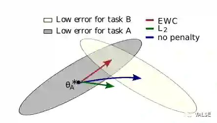 灰色和黄色分别是对应旧任务和新任务的error surface。这里为了示意,在最终收敛参数周围,使用了二次近似,在平面上,即为一个椭圆。如果我们在Finetune的时候不加入任何约束,那么最终收敛的参数自然会到新任务loss最低的地方,即蓝色箭头所指方向。但是显然,这样的结果对于旧任务是一个很差的参数。如果我们能够充分使用局部error surface的信息,使参数收敛到上图中两个椭圆重叠的部分,那必然是一个最好的结果。这也就是[4]这个工作想要达到的目的。具体做法上,作者使用了Fisher Information Matrix来近似Hessian Matrix,并为了效率考虑,只选取了对角线元素做近似,即