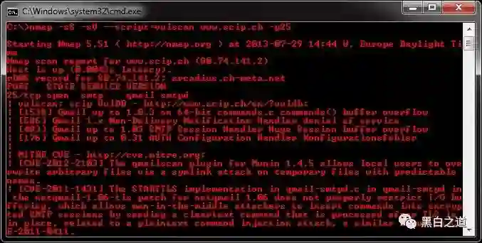 Vulscan是一个将Nmap增强为漏洞扫描器的模块。nmap选项-sV支持每个服务的版本检测,用于根据已识别的产品确定潜在缺陷。数据在脱机版本的VulDB中查找