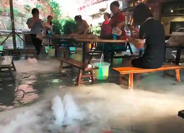水池里还专门设置了两台喷雾系统,制造出烟雾缭绕的视觉效果,而顾客在水池内,边泡脚边吃火锅。