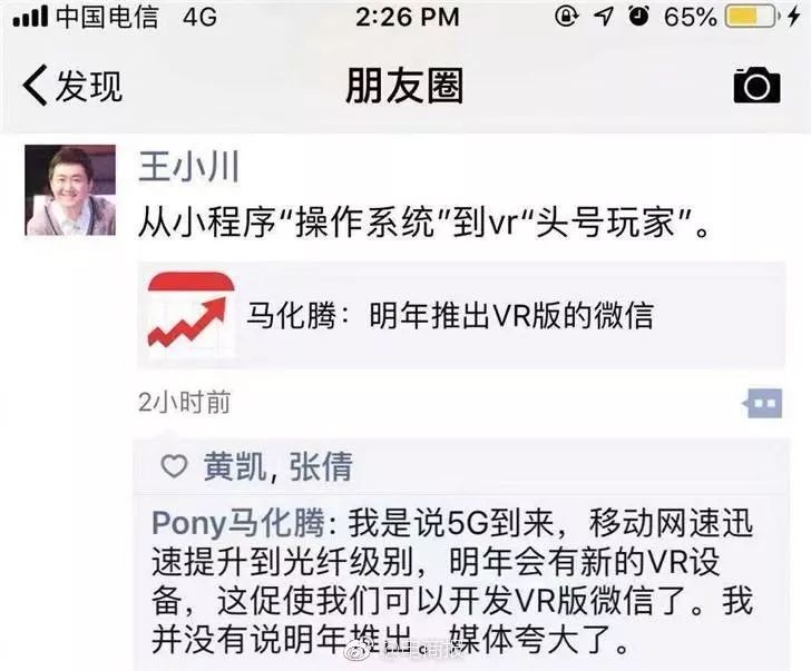 腾讯公司董事会主席兼首席执行官马化腾在演讲中称,由于5G到来,移动网速提升至光纤级别,他决定认真考虑对VR版本微信的开发。