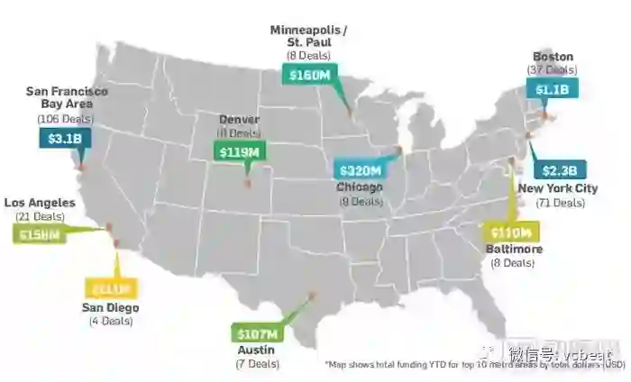 第三季度中,纽约市完成了25笔交易,投融资额近16亿美元,超过了包括旧金山湾区(8.65亿美元,29笔交易)在内的其他地区。超过50%的交易量和交易额都流向了“三巨头”:旧金山湾区、波士顿和纽约市。