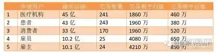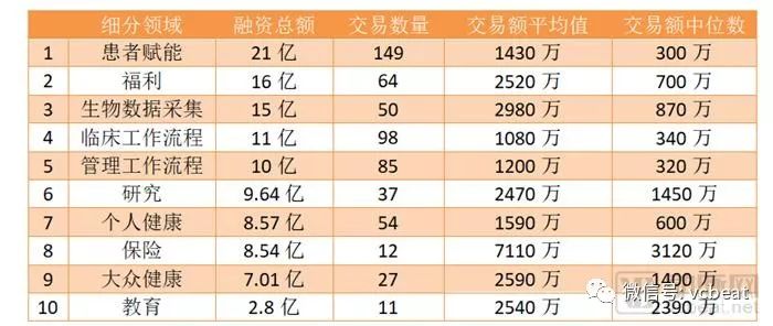“患者赋能”继续保持着数字健康领域的领先地位,投融资交易额达21亿美元,涉及149笔交易。保险领域的交易额平均值最高,交易额中位数为3120万美元。