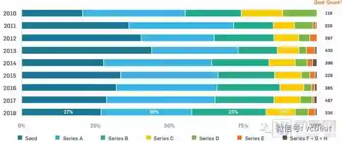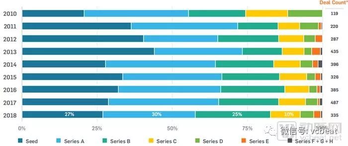 市场继续走向成熟,中后期轮次融资数量增加,表明后续投资的增加以及初创企业的持续发展。截至第三季度,B-F轮融资占2018年交易的43%,创造了自2010年以来最高的比例。