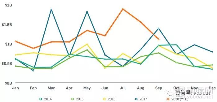 2014-2018年月度投融资交易额走势