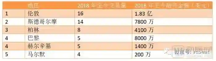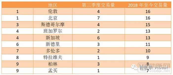 在第三季度的十大国际交易中,北京公司占其中五起,2018年累计六起交易,总投融资交易额达到8.63亿美元。作为早期轮次融资中心,伦敦和斯德哥尔摩的交易规模也在持续增长。