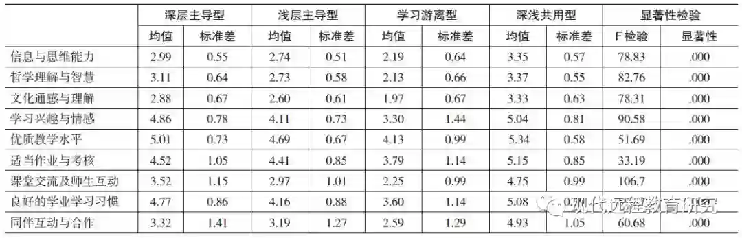 表3的结果再次印证了前述的结论,即采用深浅共用型的融合性学习者,在3个学习结果指标(即信息与思维能力、哲学理解与智慧、文化通感与理解)、1个学习情感投入指标(即学习兴趣与情感)、2个教学情境感知指标(即优质教学水平、适当作业与考核)和3个学习参与指标(即课堂交流及师生互动、良好的学业学习习惯和同伴互动与合作)上的均值得分都明显高于其他各个群体,甚至比深层主导型学习者的学习表现还要优异。