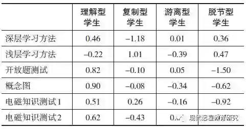 然而,在西方的众多研究中,澳大利亚学者普洛瑟(Prosser)于2000年发表在《欧洲教育心理学》上的一项研究成果(Prosser et al.,2000),却与众不同。在这篇论文中,普洛瑟和其同事基于物理概念学习方法(利用学习过程问卷(Study Process Questionnaire,SPQ))对131名学生进行了聚类分析。他们一共解析出4类学生。第一类被称为“理解型学生”(共36人),他们在深层学习方法上得分高,在浅层学习方法上得分低,并且在学期结束时有关电磁知识测试、开放性问题以及概念图等方面的成绩都非常高,这是一批优秀的学生。第二类被称为“复制型学生”(共20人),他们在深层学习方法上得分低,在浅层学习方法上得分高,在学期结束时的测试得分上比较差,这是一批学业成就不足的学生。第三类被称为“游离型学生”(共55人),他们似乎在放弃着学业,不仅在深层学习方法和浅层学习方法上的得分都比较低,而且在学期结束时的测试得分也比较低。第四类被称为“脱节型学生”(共20人),他们采用的是“融合性学习”法,即在深层学习方法和浅层学习方法上的得分都比较高,但却是四类学生中期末学习成绩最糟糕的群体(见表1)。普洛瑟用“脱节”(Disintegrated)这个词来表明这批学生对学习情境的识别、对学习方法的选择和其所达成的学习结果之间,呈现出一种矛盾、不连贯、不一致的困顿和脱节现象。
