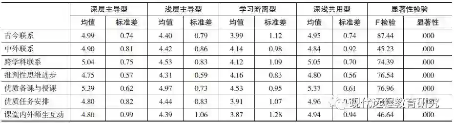 本研究案例表明,西方学者眼中的“脱节型学生”“学习异类”“学习失败者”,而在中国学生群体中,深浅共用型学生(即融合性学习群体)却展示出卓越的学习表现。由表2可见,“深浅共用型”学生在四种学习结果(古今联系、中外联系、跨学科联系、批判性思维进步)上,均值得分都显著高于浅层主导型和学习游离型学生,而与“深层主导型”学生没有显著差异。在3个课堂教学感知变量上,“深浅共用型”学生对教学的感受也颇佳,显著高于浅层主导型和学习游离型学生。