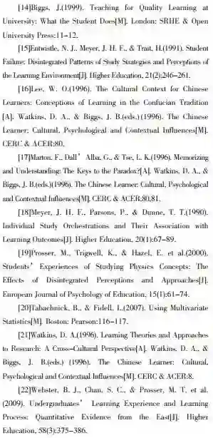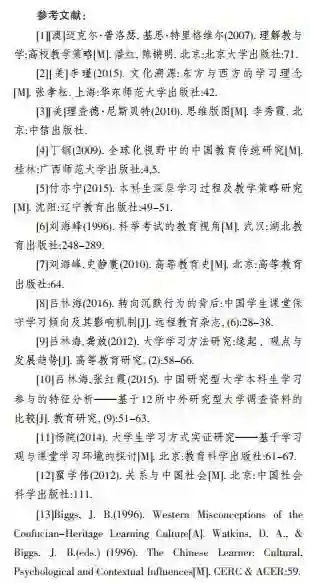 本文的结论在进一步展现中国学习者独特学习模式的同时,也折射出一种中国本土教育研究的必要性。具体而言,“跳出西方中心主义的学术框架”(丁钢,2009),展开面向中国学生、中国独特教育传统的深度研究,揭示中国乃至东亚文化滋养下新奇而丰富的教育景象,将是未来颇具价值和意义的研究方向。笔者在本文中所做的“融合性学习”研究,连带着笔者近年来陆续展开的“中国学生沉默学习研究”(吕林海,2016)、“中国大学生的学习参与特征研究”(吕林海等,2015),正在相互印证、彼此关联地勾勒出一幅愈加完整的中国学生的学习与教学概貌图。灿烂而悠久的东方文明,像基因一样根植和流淌在中国学习者的血脉深处。沃特金斯说:“我们之所以是我们,是因为我们经历的是一种基于文化的学习。”(Watkins,1996)中国的教育研究者们,理应肩负起挖掘、提炼乃至保存中国教育文化的重任,让承载着中国文化特质的学习模式被展现、被推广,让中国的教育研究真正回归到真实的中华文化土壤和中国情境之中,这样才能有力而深刻地发出中国自己的教育声音,贡献中国教育独特的智慧和力量。只有不断地在此方向上加以努力,我们才可能对加拿大著名学者许美德女士如下的发问做出信心满满的回答,即“在今天的全球化时代,中国教育界应当思考,我们为世界教育的发展究竟能贡献什么?”(丁钢,2009)