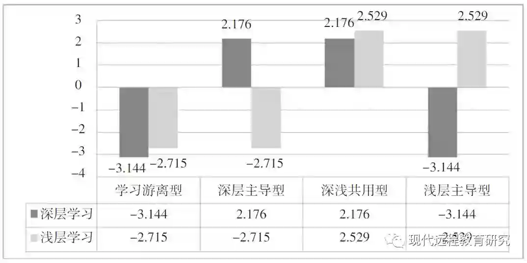 基于深层和浅层两种学习方法,笔者运用K-Means方法对人群进行聚类分析,共得到与前述两个研究相类似的4类群体。第一类群体为深浅共用型,人数占比27.5%;第二类群体为浅层主导型,人数占比41.4%;第三类群体为深层主导型,人数占比15.0%;第四类群体为学习游离型,人数占比16.1%。由此可见,对于“两课”课程而言,采用深浅共用的融合性学习的人群比例虽然不高,但与前两个研究相比有所提升,这可能与“两课”是研究生的必修课有较大的关联性。