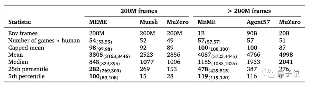 因此,为了检验经过上述步骤的智能体MEME的效率和性能,研究团队分别在2亿、10亿、200亿、900亿帧环境进行了训练。