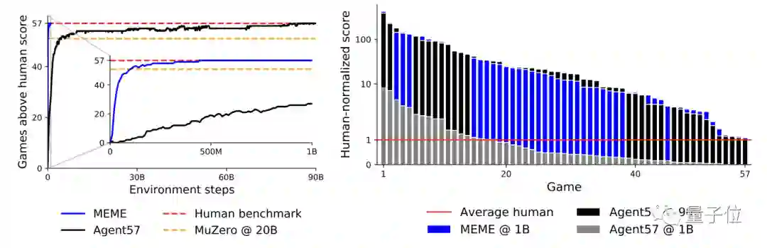 通过下图可以直观的看出,新智能体MEME在3.9亿帧时就超过了人类基准,比Agent57快了两个数量级,并且在将参数量从90B减少到1B的情况下,取得了类似的最终表现。
