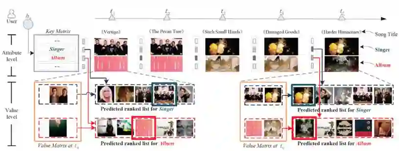 图中最上方的代表时间轴;第二行代表每个商品所具有的属性,也就是记忆网络中的键,此处以歌手和专辑为例;第三行为每个属性所产生的推荐列表。从图中第二行可以发现,一开始初始化时,推荐系统觉得用户更喜欢歌曲的专辑(一开始歌手权重较小,方框颜色较浅,专辑权重较大,颜色较深);后来随着时间的推移,推荐系统渐渐发现用户更喜欢歌曲的歌手而不是专辑(歌手方框颜色变深,专辑变浅)。从第三行可以发现,一开始推荐系统的判断是错误的,产生的推荐列表也不那么准确,但是时间越长,判断也趋向于准确,并且也给出了推荐理由,用户想听这个歌手的歌而不是这个专辑的歌。