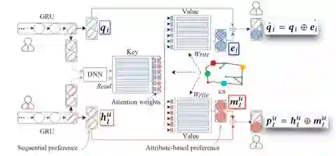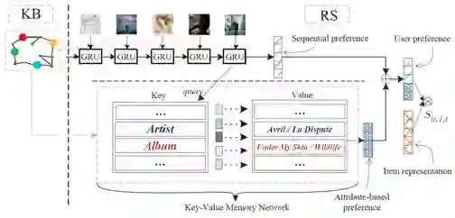 上图刻画了KSR模型的基础架构,GRU部分用来捕获用户序列偏好,KV-MN(键值记忆网络)用来捕获属性为基础的偏好特征。