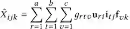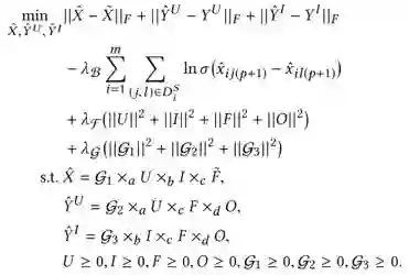 然后对其进行Tucker分解,加上非负性约束。这里的非负性约束刚好可以对应评级时的非负分数。Tucker分解就是将一个三维张量分解成三个因子矩阵和一个核张量,这个核张量可以刻画不同张量中的各个元素彼此交互的程度。