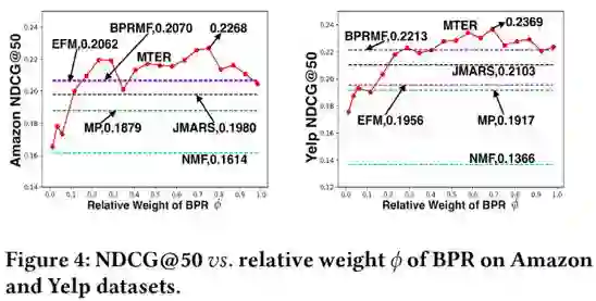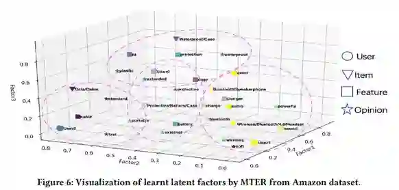 下图反映了即使在随机打乱的数据集下,MTER模型依然可以准确地捕获用户、item、特征、评价短语之间的联系。从而说明MTER模型可以有效建模用户、item、特征、评价短语四者之间的关联并给出合理的推荐结果。