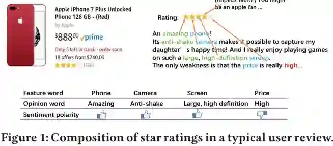 MTER模型从用户评论(opinionated content)中提取item细粒度的个性化特征,如下图所示。论文提出了一个用于可解释推荐任务的多任务学习方法,通过联合张量分解将用户(user)、产品(item)、特征(feature)和观点短语(opinionated phrase)映射到同一向量空间。