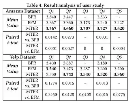本文还做了一个用户测试,提出5个问题,对几个推荐系统的性能进行打分。问题1:一般来说,您对此推荐感到满意吗?问题2:你认为你对推荐的产品有所了解吗?问题3:解释是否有助于您了解推荐项目的更多信息?问题4:根据推荐的项目,您认为您对我们推荐此项目的原因有所了解吗?问题5:您认为解释有助于您更好地理解我们的系统,例如,根据我们提出的建议吗?