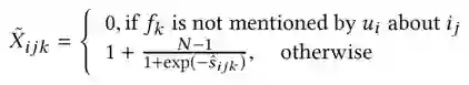 表示用户i对item j的特征k的欣赏程度。假设itemj的特征k被用户i提及了 t_ijk 次,而且每次的情感极性标签为