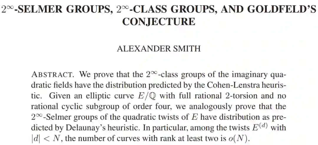 这篇论文的作者是哈佛大学的研究生 Alexander Smith,他现在是斯坦福大学的 Clay fellow。Smith 一直在探究椭圆曲线方程解的性质。在研究这个问题的过程中,他验证了 Cohen-Lenstra 猜想的特定部分,并且恰好涉及 Koymans 和 Pagano 的工作中关于类群的部分。