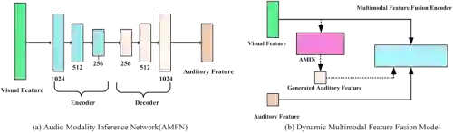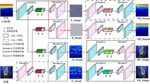 该模型包含四个子网络,分别为A-V(听觉到视觉),V-A(视觉到听觉),A-A(听觉到听觉)和V-V(视觉到视觉)子网络。每个子网络均由一个编码器和一个解码器组成。这四种子网络以对称的形式组成了两种生成路径,一种是V-A-V/A-V-A(视觉-听觉-视觉/听觉-视觉-听觉),另一种为跨模态生成路径A-A-V/V-V-A(听觉-听觉-视觉/视觉-视觉-听觉)。