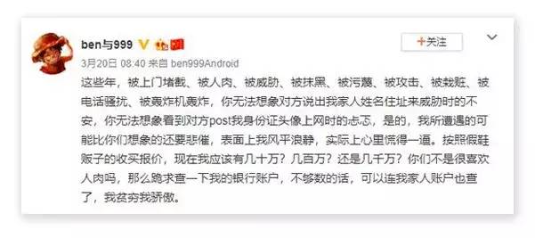 资深鉴定师、“get”版主“ben与999”曾微博曝光其受到威胁,在圈内引发震动。今年2月份,假鞋贩子“猛哥”开出20万的价格,要求他在平台鉴定通过200双鞋,他没有同意,不久便被查到电话、家庭住址,被威胁恐吓甚至上门堵截。