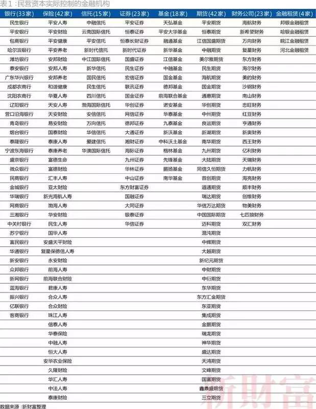 在对800余家持牌金融机构前十大股东数据统计的基础上,新财富绘制出了第一份相对完整的“民营金融时局图”,包含了银行、保险、信托、证券、基金、期货、财务公司、金融租赁等八个细分领域的民营金融机构(表1)。新财富的统计数据显示,由民营资本实际控制的金融机构数量达到了200家,具体包括:银行33家、保险42家、信托15家、证券23家、基金18家、期货42家、财务公司23家、金融租赁4家,其2016年末合计的资产规模高达25.75万亿元。