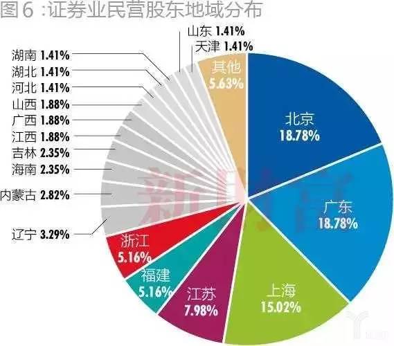 全国证券业前十大股东中,民营股东的数量为213家,地域分布位居前三位的省市与保险一样是北京、广东、上海(图6)。其中,北京与广东以40家并列首位,占比18.78%,上海以32家紧随其后,占比15.02%。