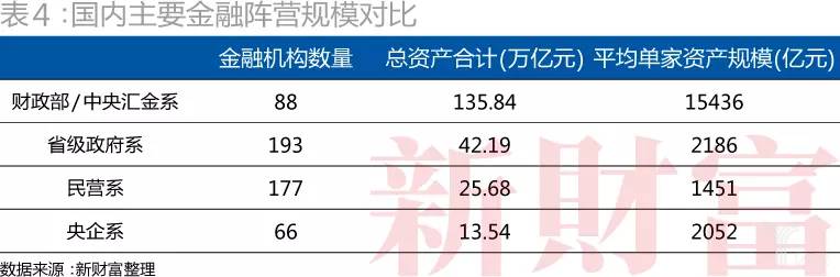 新财富的分类统计数据显示,中央汇金系金融机构总数为88家,截至2016年末合计的总资产为135.84万亿元;全国省级政府系金融机构的数量为193家,同期资产规模合计为42.19万亿元;民营系金融机构(不含财务公司)数量为177家,资产规模合计为25.68万亿元;央企系金融机构(不含财务公司)数量为66家,资产规模合计为13.54万亿元(表4)。