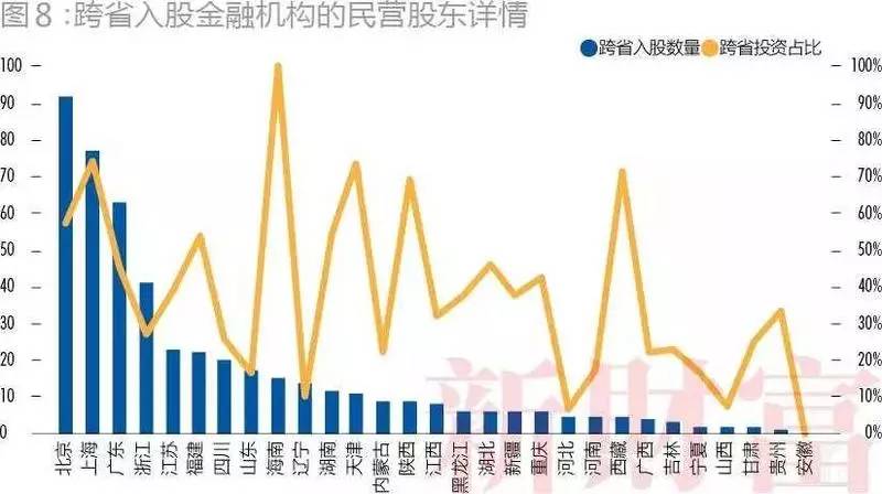 特殊区域之一:北京。虽然北京以92家位居首位,但需要特别说明的是,其作为资本的聚集中心,注册于北京的民营股东,其资本不少来自于全国各地,因而跨省投资于全国各地金融机构的数量最多也不意外。