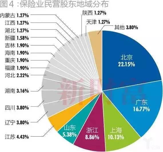 全国保险业前十大股东中,民营股东的数量为316家,地域分布位居前三位的省市分别是北京、广东、上海(图4)。北京以70家居首,占比22.15%;广东53家,占比16.77%;上海32家,占比10.13%。由于全国的保险机构总部注册于北京、上海、广东深圳者占据相当比例,因而这三个省市的民营企业入股便得以近水楼台先得月。民营金融业发达的浙江同样表现不俗,进入保险业前十大股东的数量为28家,排第4位。