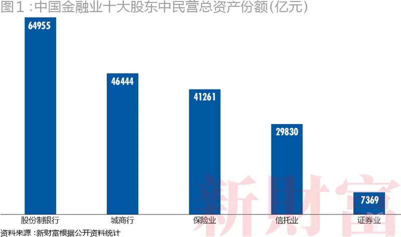 按照统计数据,全国性股份制银行资产总额约42万亿元,十大股东中民营份额占有6.5万亿元;全国城商行资产总额约23.7万亿元,十大股东中民营份额占有4.64万亿元;全国保险业资产总额约17.3万亿元,十大股东中民营份额占有4.13万亿元;全国信托业资产总额(包含自有资产及信托资产)约16.4万亿元,十大股东中民营份额占有2.98万亿元;全国证券业资产总额6.83万亿元,十大股东中民营份额占有0.74万亿元(图1)。