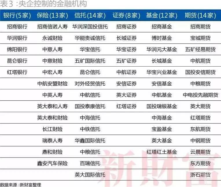 根据新财富的统计,实业类央企所控制的金融机构总数为66家(不含央企财务公司),具体包括:银行5家、保险13家、信托14家、证券8家、基金12家、期货14家(表3)。可见,实业央企阵营的金融机构数量远低于民营阵营,其最为欠缺就是银行牌照。