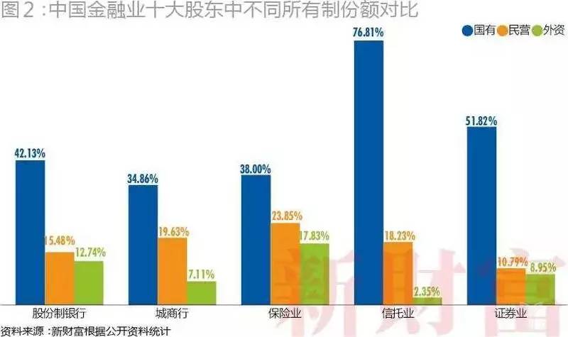 图2中信托业前十大股东的不同所有制占比情况,基本反映了整体情况,因为该行业股权相对集中,其前十大股东的合计持股比例已经高达97.39%。其他四个细分领域,民营资本的份额或多或少都存在被低估的情况。