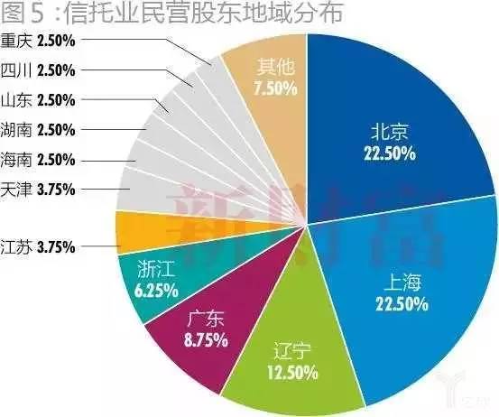 全国信托业前十大股东中,民营股东的数量较少,仅有80家,地域分布位居前三位的省市是北京、上海、辽宁(图5)。其中北京与上海皆以18家并列居首,占比同为22.5%,辽宁以10家居第三,占比12.5%。信托业的民营股东数量少,与其民营化程度直接相关,该领域是国内民营化程度最低的一个细分金融领域,国有资本控制着超过3/4的产权份额。另外值得注意的是,浙江的民营资本对信托业的投资热情并不高,仅有5家民营股东进入了信托业的前十大股东。当然,也许因为浙江民资大规模进入了银行领域,功能近似银行的信托机构,对他们而言就不是那么有吸引力了。
