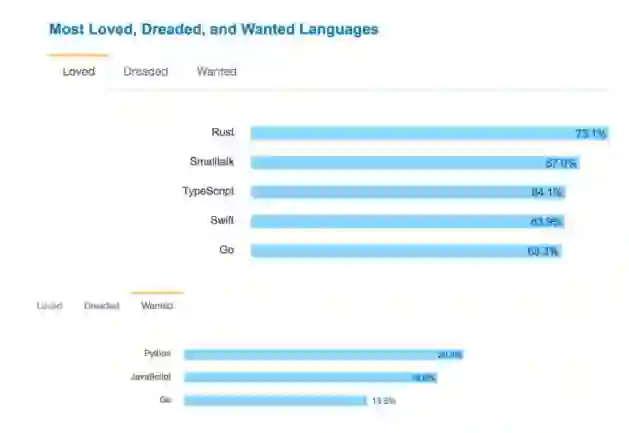 用 Go 的开发者喜欢它(最喜欢的是 Rust),没用过的人也迫切想用它。Go 是云基础设施语言,每一家云服务公司的基础设施中都有用 Go 实现的关键组件,它也是阿里巴巴、Cloudflare 和 Dropbox 等公司的云设施的关键组成部分。