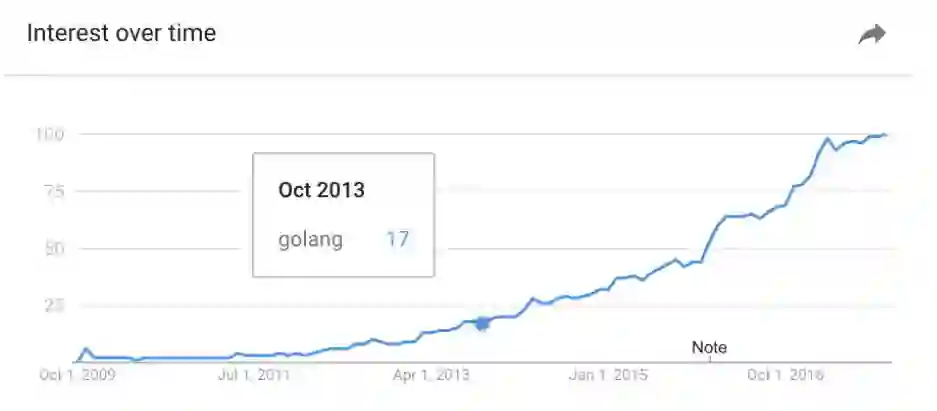 Go 语言的受欢迎程度在过去的 8 年里呈指数增长,并且还在持续增长。