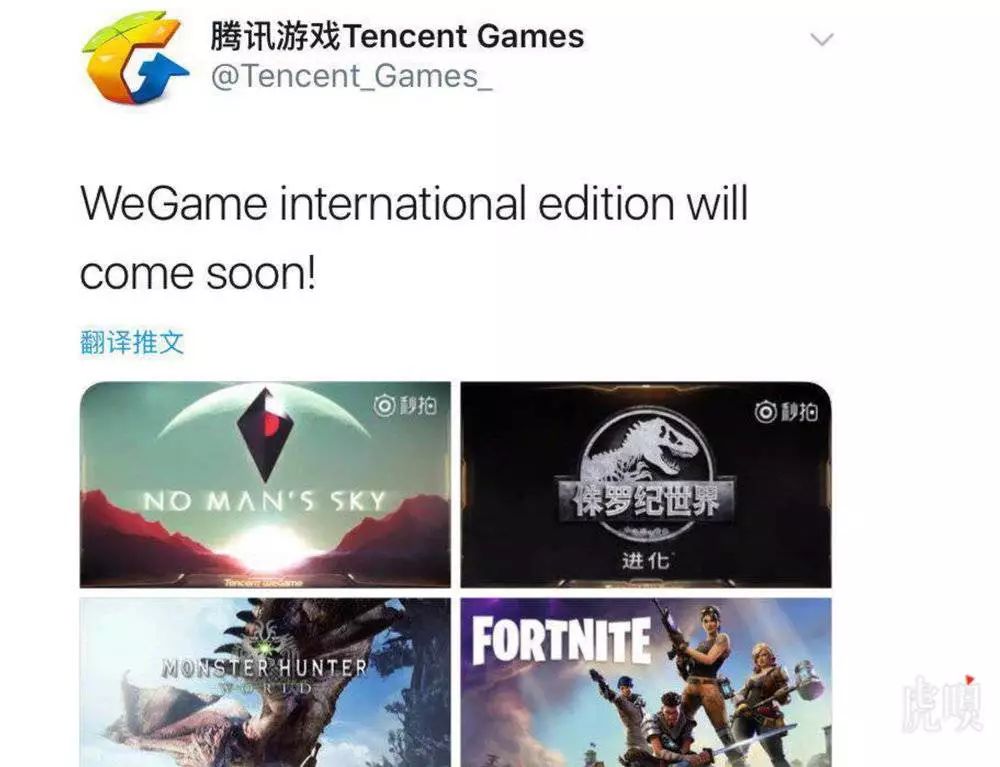 @新浪财经【腾讯官宣:WeGame国际版即将上线】7月11日晚间,腾讯游戏在其官方推特上宣布,WeGame国际版即将上线,同时,该推特配图为WeGame代理的四款游戏,分别为No Man’s Sky(《无人深空》)《侏罗纪世界》Monster Hunter(《怪物猎人》)Fortnite(《堡垒之夜》)。