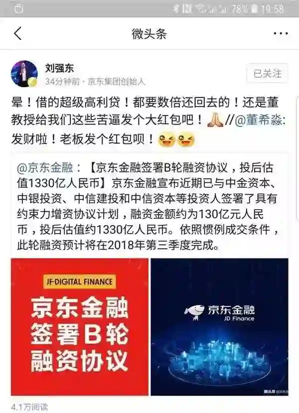 而在微头条中,京东CEO刘强东却对大家的祝贺表示不解,同时表示虽然京东金融在B轮中成功融资130亿元,但是这都是借的超级高利贷!都要数倍还回去的!还是董教授给我们这些苦逼发个大红包吧!