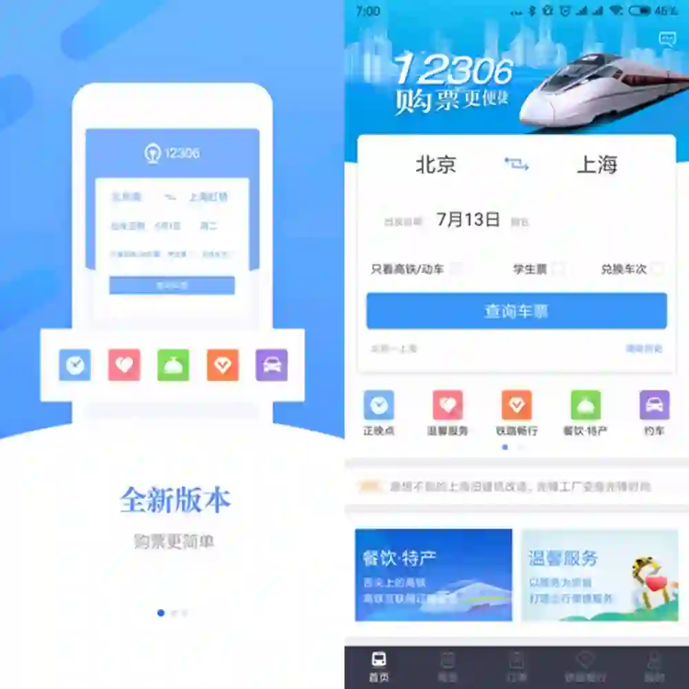 @快科技【12306客户端4.0版发布,界面更清新】中国铁路客服中心12360手机客户端升级到全新的4.0版本,Android、iOS同步更新,从界面到功能都有了很大变化。新的12306客户端改用了更加清新养眼、更趋于扁平化的设计。新版12306客户端的流畅度也大大提升,界面切换、功能服务都毫无卡顿,订票流程基本没变但也感觉顺畅了很多。