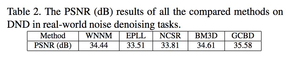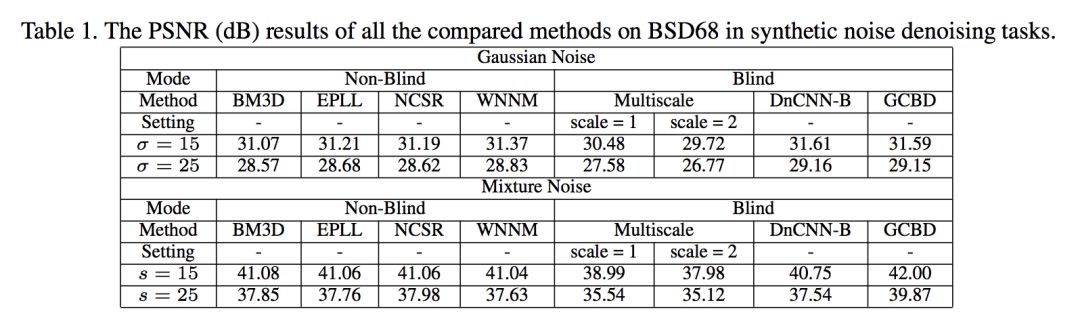 可以看到在高斯盲去噪方面,文章提出的方法 GCBD 和 DnCNN 不相上下,而在合成噪声去噪方面,GCBD 则达到了最高水平。文中所用到的混合噪声为 10% 的均匀分布噪声(分布区间为[-s,s]),20% 的高斯噪声(N(0,1)),70%的高斯噪声(N(0,0.01)。