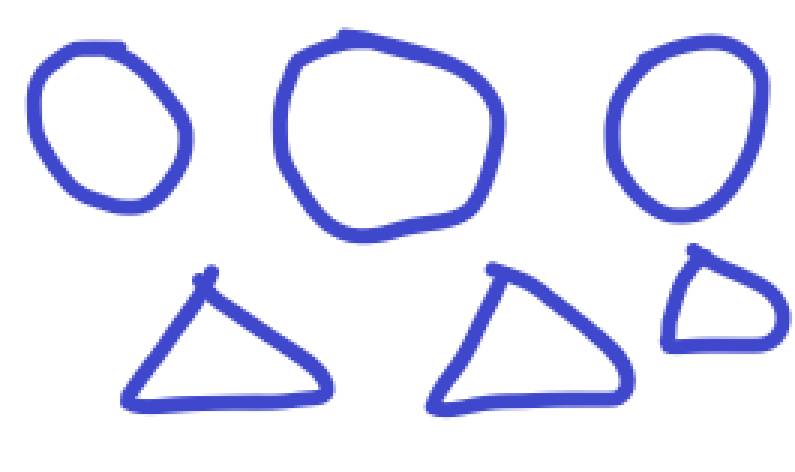 举个例子,如图所示,在没有任何提示(无训练集)的情况下,需要把下列六个图形分成两类,你会怎么分呢,当然是第一排一类,第二排一类,因为第一排形状更接近,第二排形状更接近。