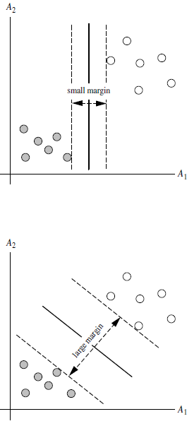 SVM 考虑寻找一个满足分类要求的超平面 , 并且使训练集中的点距离分类面尽可能的远 , 也就是寻找一个分类面使它两侧的空白区域 (margin) 最大。