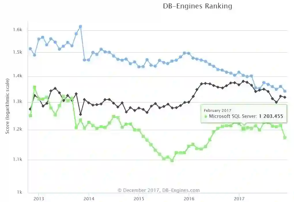 DB-Engines 发布了 2017 年 12 月份的数据库排名。排前 20 名的数据库中,Oracle 稳居第一,排名在第 9 名的 Cassandra 赶超排在第 8 名的 Redis,第 14 名的 SAP Adaptive Server 赶超第 13 名的 Solr,SQLite 有小幅下降趋势。